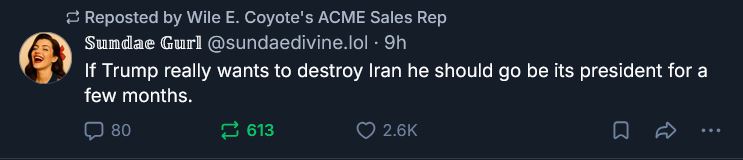 It's worth noting, again, that the United States and Iran had a functional, working agreement, one that took years of negotiations and tenacity to obtain, to curtain Iran's nuclear ambitions. Felon47 tore that agreement up when he was Fraudster45 for no reason other than it was something the Black guy did. That abdication of international agreement by the U.S. led directly to last summer's bombings that Felon47 claimed, ridiculously, had "obliterated" Iran's nuclear infrastructure. Today's unprovoked attacks put the lie to that claim, or render it irrelevant. The Tyrant of Mar-a-Lago probably did this, not for any national security reasons, but at the behest of his enablers in Qatar, Saudi Arabia, and other Mideast kingdoms. And maybe to help out his fellow war criminal Bibi Netanyahu. And to make the news focus something other than the Epstein files and the spectacularly bad polling on Felon47 generally.