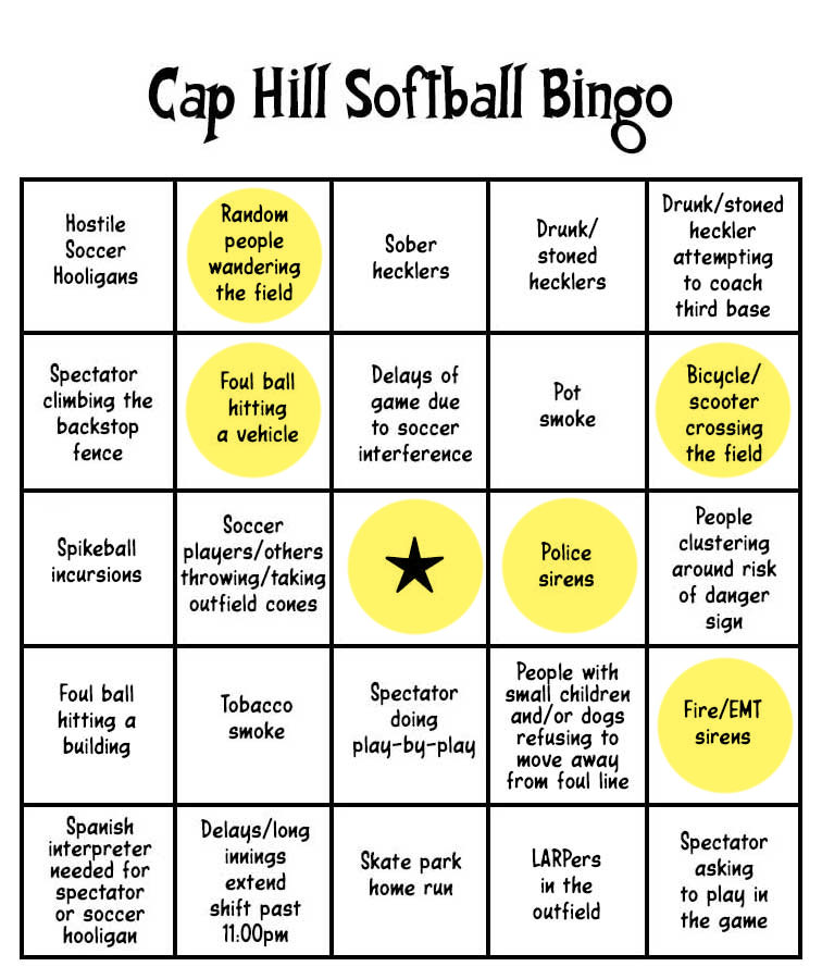 At some point I need to update the Cap Hill Softball Bingo Card to include some new squares: Foul ball off the light pole, threats from misogynist spectators, and cop on a bullhorn to vagrant elsewhere in the park saying "Wake yo' ass up." The latter happened last night.